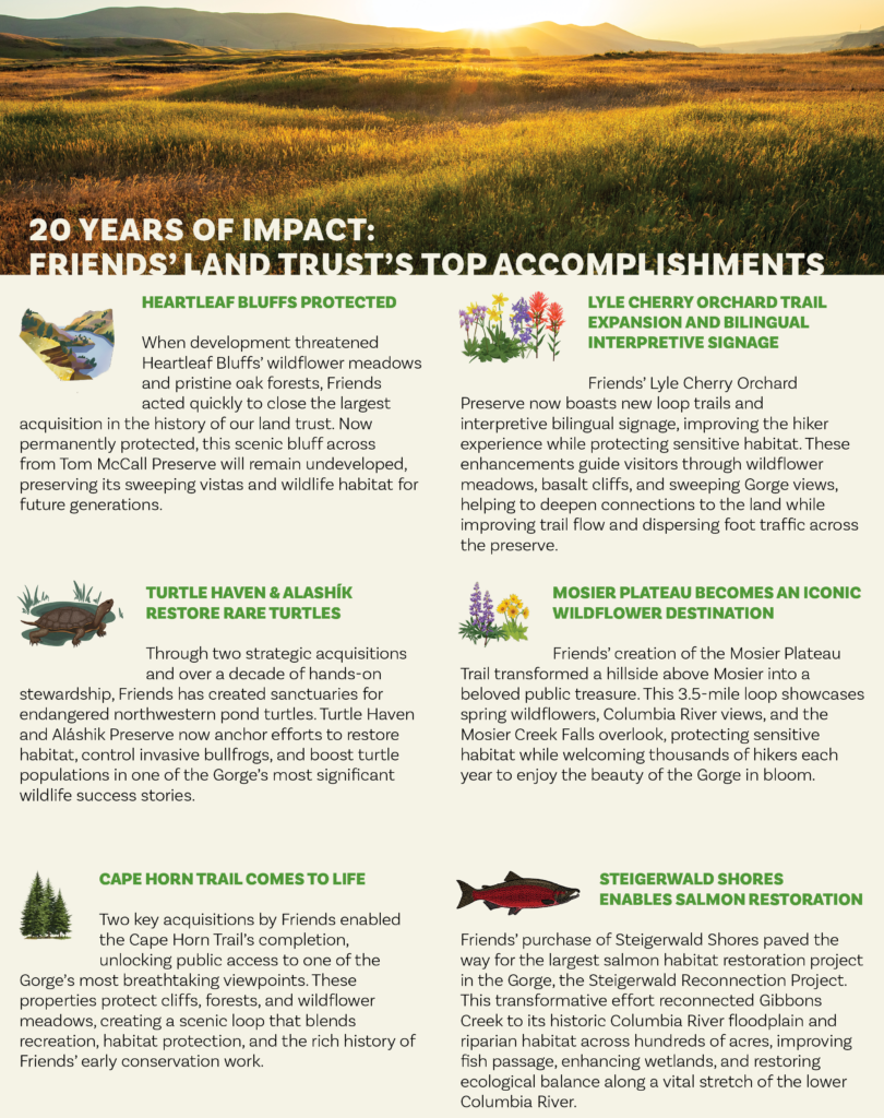 Kate McBride, hired in 2006 as the land trust’s first staff member, shared that “the land trust has been such a positive force for the organization. Becoming a Gorge landowner and caring for the land gave Friends a level of local credibility it hadn’t had before.”