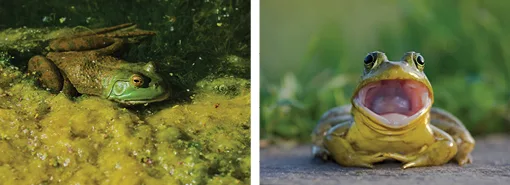 American bullfrogs are stout frogs and adults have been documented to grow up to eight inches in length and weigh over two pounds (that’s one third the weight of the average human baby). They have long, hind legs and fully webbed hind feet. Their skin is smooth, and the color on their topside is typically tan, brown or olive-brown with varying amounts of black mottling, and their underside is a light cream color with dark mottling. Females have bigger bodies than males however the most distinguishing feature between sexes is their tympanum (or eardrum; located just behind their eye).